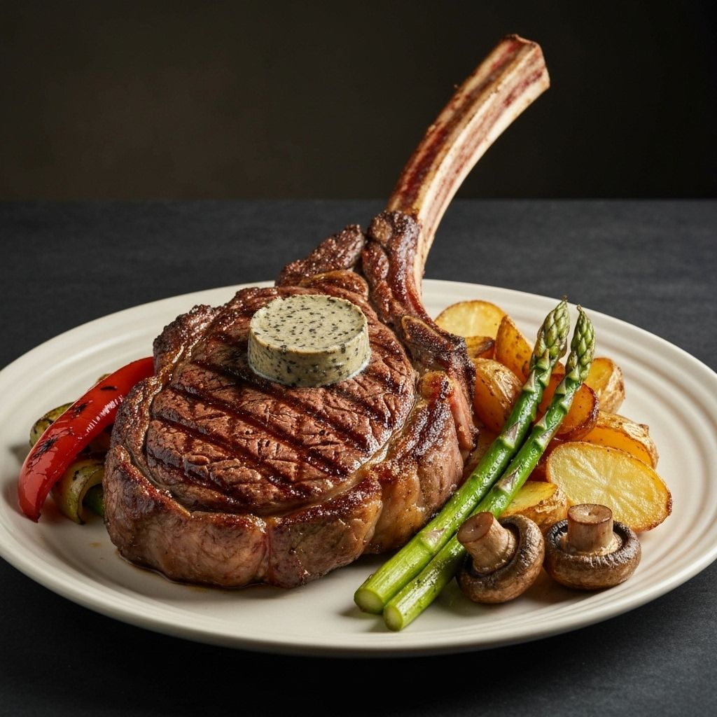 A spectacular 48oz dry-aged tomahawk ribeye, grilled to perfection and finished with black truffle butter. Served with roasted seasonal vegetables and crispy potatoes. A showstopping centerpiece.