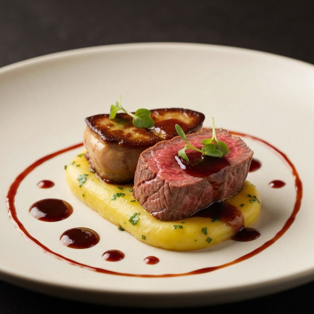 Exquisite 8oz Japanese A5 Wagyu beef fillet paired with butter-seared Hudson Valley foie gras, served with crispy potato pavé and a luxurious black cherry and Barolo wine reduction.